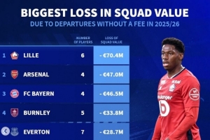 体育资讯7月10日讯 《转会市场》统计了今夏因为球员自由身离队而身价损失情况,里尔、阿森纳、拜仁分列前三。
